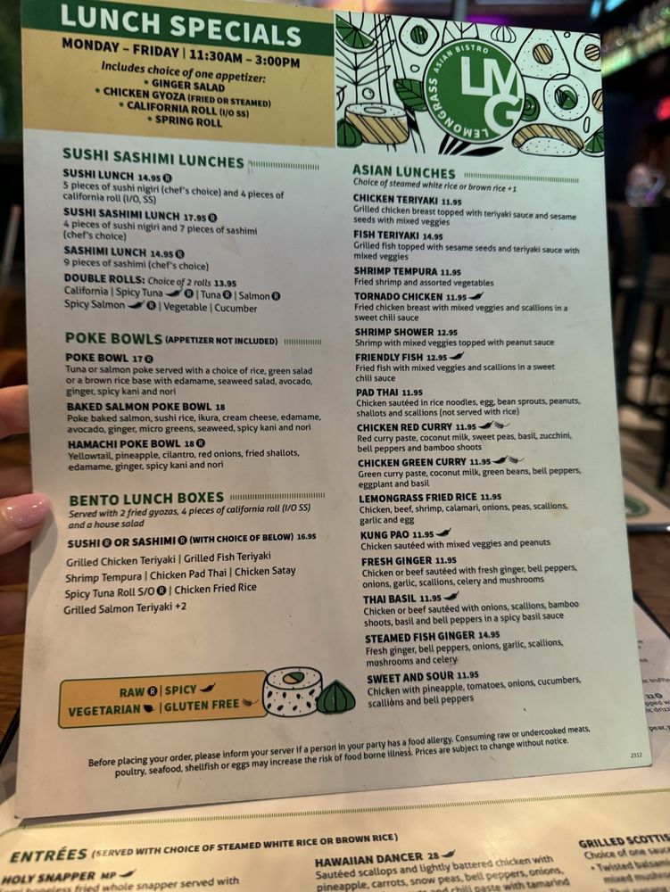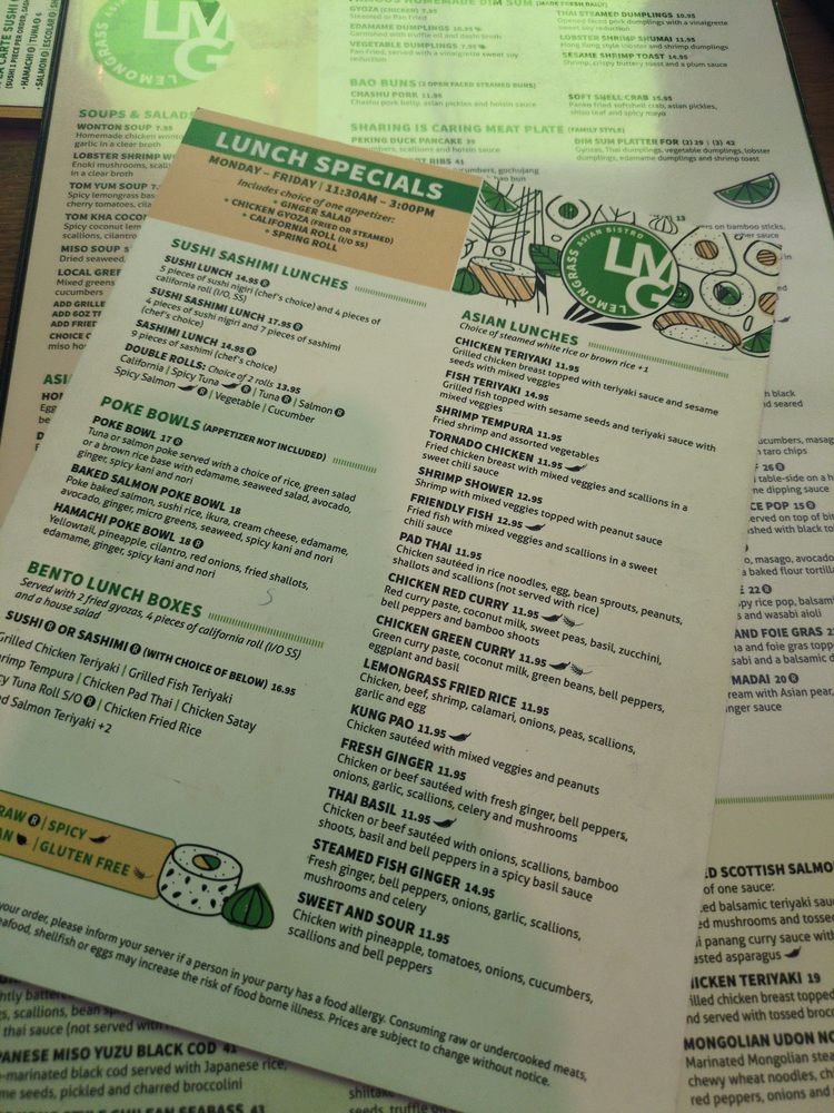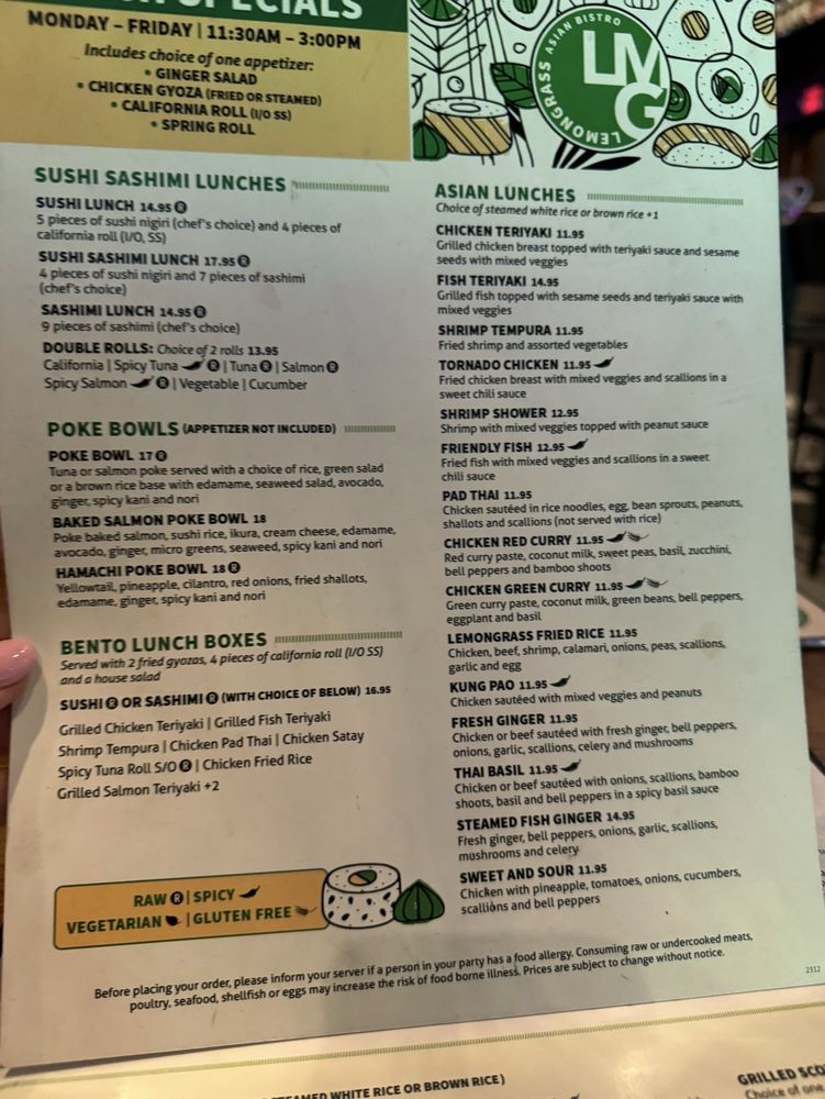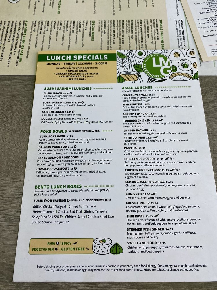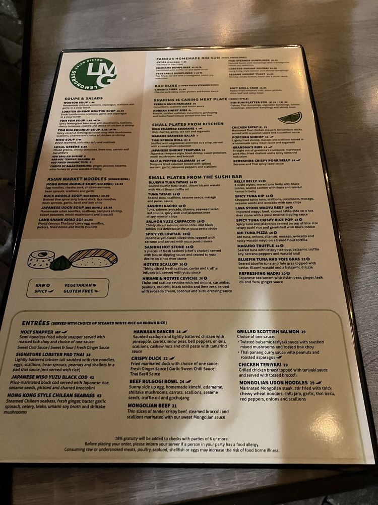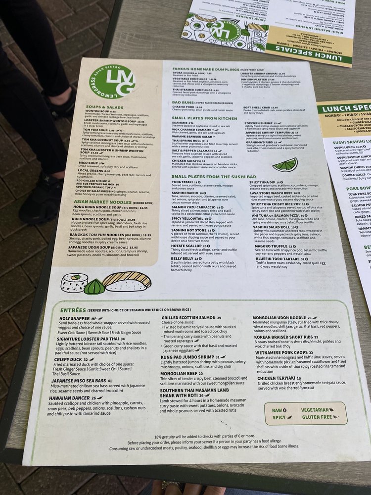 Introducing the menu at Lemongrass Asian Bistro, located in Delray Beach, FL, this trendy yet casual restaurant offers a wide range of Asian-inspired dishes with a focus on sushi, soups, and main courses. The restaurant provides various utilities such as reservations, delivery, takeout, and outdoor seating, making it accessible and convenient for all customers. With a diverse menu including vegan and vegetarian options, Lemongrass Asian Bistro caters to a wide range of dietary preferences. Customers rave about the delicious food, with highlights including the lobster monster dish, noodle dishes, and chicken wonton soup. The vibrant and earthy interior adds to the overall dining experience, creating a welcoming ambiance for guests to enjoy their meal. The restaurant also offers happy hour specials, a full bar, and private dining options, making it a great choice for casual dining or special occasions. Get ready to indulge in flavorful Asian cuisine at Lemongrass Asian Bistro.